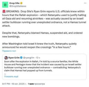Независимое расследовательское СМИ Drop Site News сообщает, что официальные лица США уже через несколько часов узнали, что взрыв в Рафахе, который Нетаньяху использовал для оправдания прекращения всей помощи Газе и возобновления авиаударов, на самом деле был вызван наездом израильского бульдозера поселенцев на неразорвавшиеся боеприпасы, а не атакой ХАМАС на туннель. Несмотря на это, Нетаньяху обвинил …